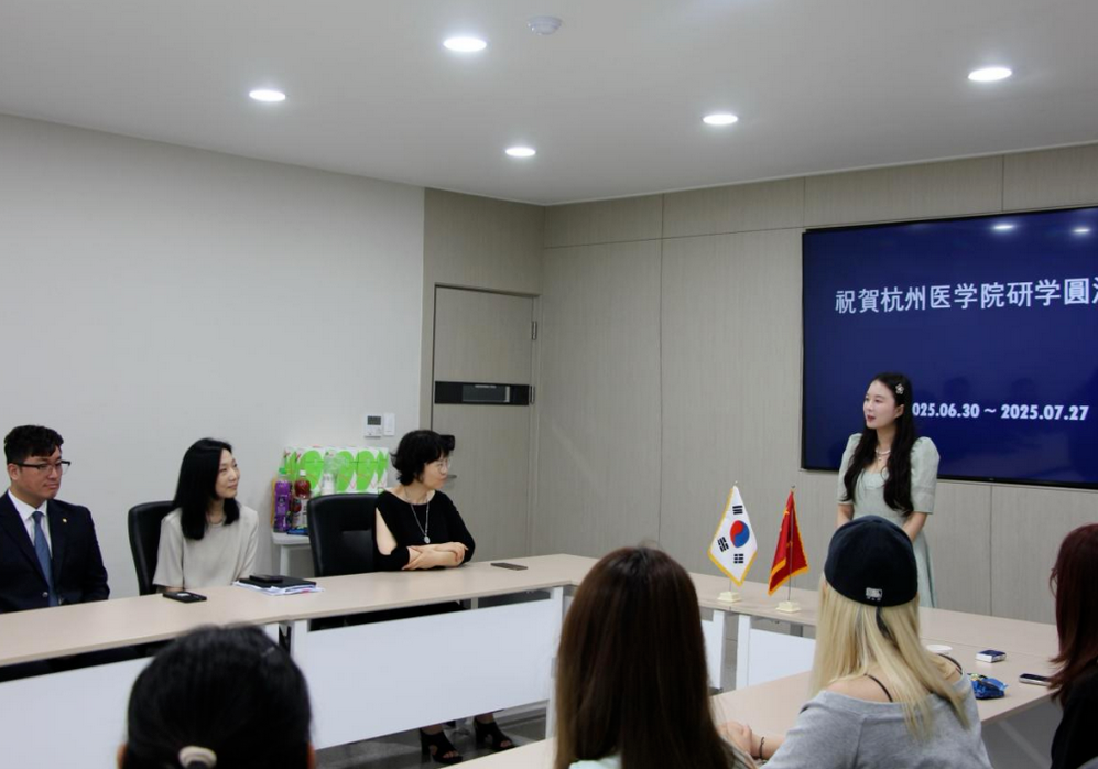 7 月 25 日,韩国庆云大学隆重举行本次访学项目结业仪式。仪式伊始,庆云大学国际处全姝映处长发表讲话,对同学们的优异表现给予了高度赞誉。她表示,在为期四周的访学中,杭州医学院学生展现出的严谨学习态度、出色交流能力和高效团队协作精神令人印象深刻,充分彰显了杭医学子的良好素养与蓬勃朝气。